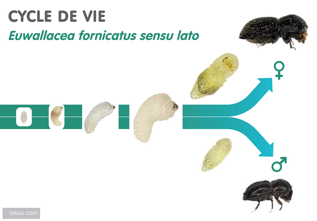 - Le cycle de vie Euwallacea fornicatus sensu lato est relativement court (de 3 à 6 semaines), ce qui permet à une seule génération d'adultes de se reproduire rapidement et de donner naissance à plusieurs générations en un an.